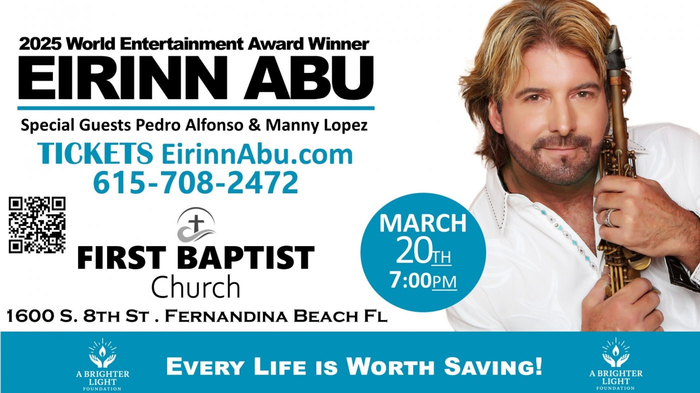 Join saxophone recording artist and 2025 World Entertainment Award Winner Eirinn Abu, along with Grammy-winning violinist Pedro Alfonso and Grammy-winning guitarist Manny Lopez, live in concert Friday, March 20th at 7pm at First Baptist Church of Fernandina Beach Florida.