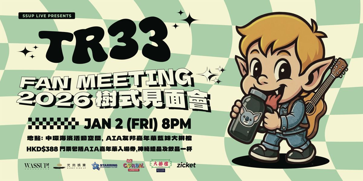 香港新世代人氣創作歌手 Tr33 將於 1 月 2 日中環海濱活動空間 AIA 友邦嘉年華「藍妹大排檔」舉行 2026 年首個個人音樂見面會。Tr33 的音樂風格偏向流行與情感元素,於 2020 年開始街頭演出,以獨特的音樂風格和深情的歌聲在樂壇嶄露頭角,他的代表作包括《沉船仔》和《你知道你比晚霞好看嗎》等,近年來,Tr33在串流平台上取得了驚人的成績,多首歌曲登上各大音樂榜單,並獲得業界和樂迷的一致好評。是次音樂會門票已包括 AIA 友邦嘉年華入場券一張、神秘禮品一份及免費飲品換領劵一張,歌迷更可率先欣賞 Tr33 現場演繹全新作品!樹熊們萬勿錯過與 Tr33 近距離互動的機會,立即訂飛,並挑選好你最期待他為你演唱的歌曲!