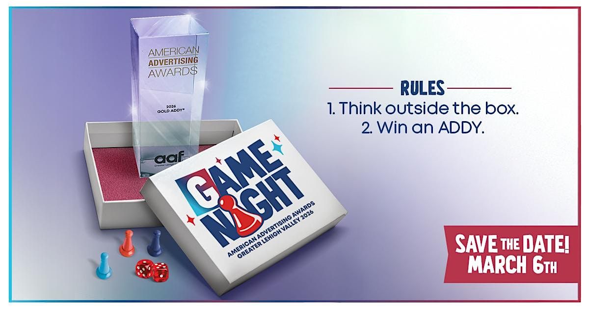 Join us for the most anticipated creative event of the year — the 2026 AAF-GLV Design Awards Gala held on Thursday, March 5, at Cedar Crest College (Canova Dining Hall within the Tompkins College Center) in Allentown. This year’s theme brings a playful twist to our celebration of outstanding advertising and design work across the Greater Lehigh Valley.