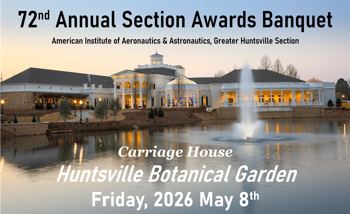 Please consider joining us as we continue our annual tradition of honoring distinguished members of the Aeronautics & Astronautics (AIAA) Greater Huntsville Section (GHS). The 72nd Annual Section Awards Banquet will be held on Friday 2026 May 8th, with doors opening at 5 PM CDT for a welcoming social. Huntsville Botanical Garden's Carriage House is inside the main building, to the right/east side.