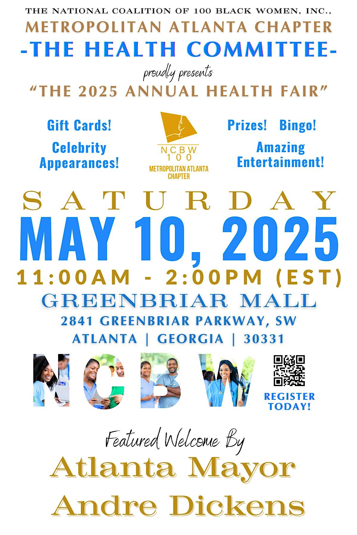 The Metropolitan Atlanta Chapter of The National Coalition of 100 Black Women, Inc. advocates for black women and girls, promoting equity and leadership in the areas of health, education, public policy, and economic empowerment. To extend our health advocacy to the community, the Health Committee hosts an annual health fair, located in high-traffic public areas such as malls and community centers, reaching the most vulnerable populations in Atlanta. The fair provides free services like health screenings and resources while educating the public on health and wellness.