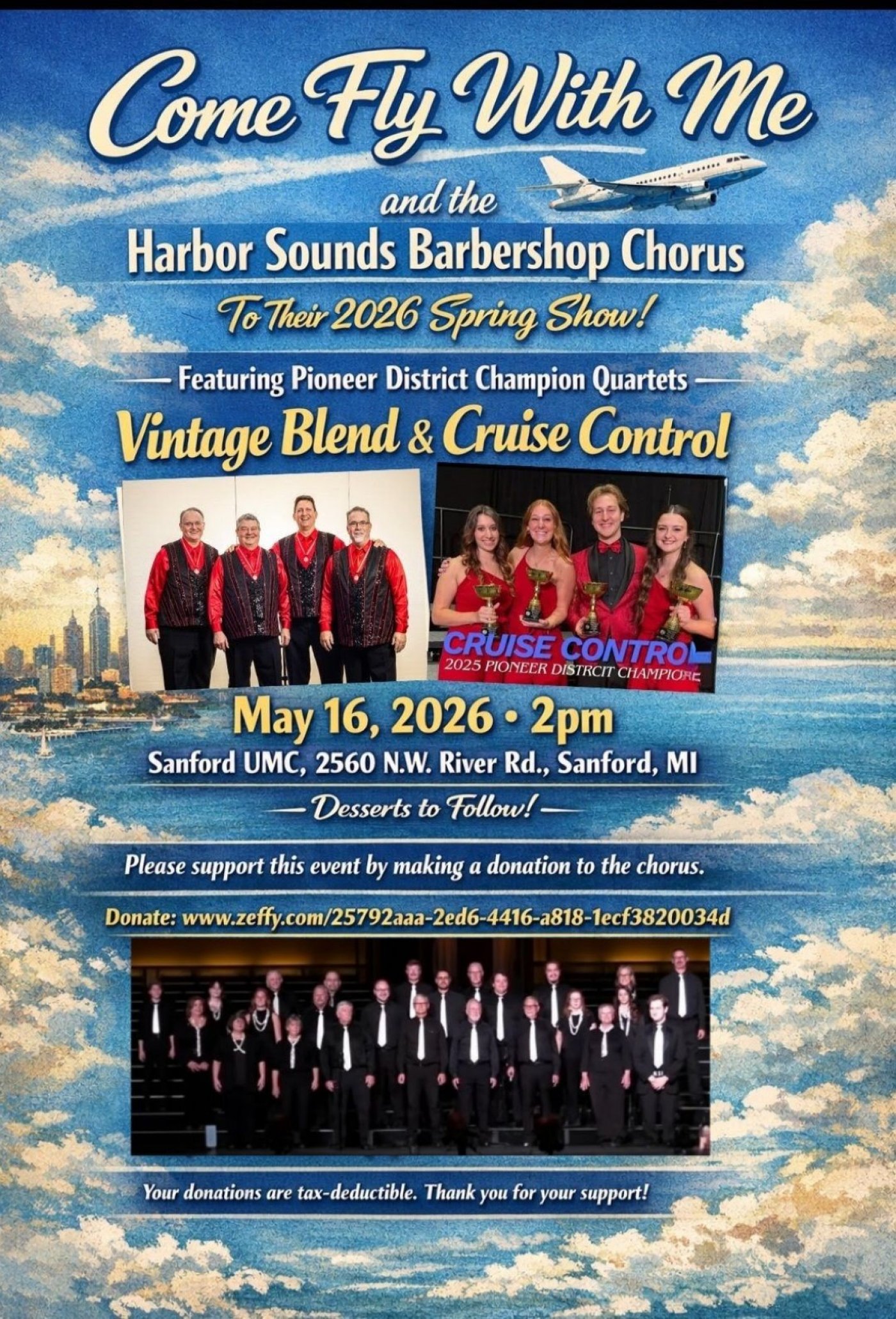 Harbor Sounds Barbershop Chorus invites you to attend their 2026 Spring Show. Featuring Pioneer District Champion Quartets: Vintage Blend and Cruise Control. Enjoy Broadway, Musicals, and traditional songs. May 16 2026 at 2 p.m. Desserts to follow. Venue: United Methodist Church of Sanford 2560 N. West River Rd Sanford Mi This event is free with options to donate. See more details: https://www.facebook.com/HarborSoundsChorus