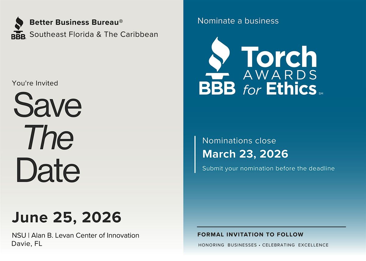 The BBB Torch Awards for Ethics is the premier recognition for businesses and non-profits that maintain an unwavering commitment to integrity. On June 25th, we gather at the NSU | Levan Center of Innovation to honor the organizations that aren't just doing business; they’re doing good.