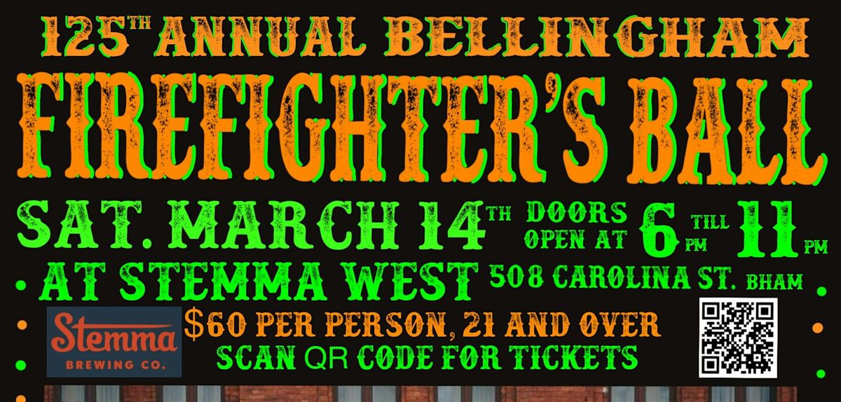 Bellingham's Bravest, you are formally invited to the 2026 Bellingham Firefighter's Ball. This is a night to celebrate with friends and family your hard work and sacrifice to the greatest calling in the world. Please join us at 508 Carolina st. (The former Twin Sisters building) for a night of dancing and fun. The ball will begin at 6pm and conclude at 11pm. March 14th is the date. This is a 21+ event.