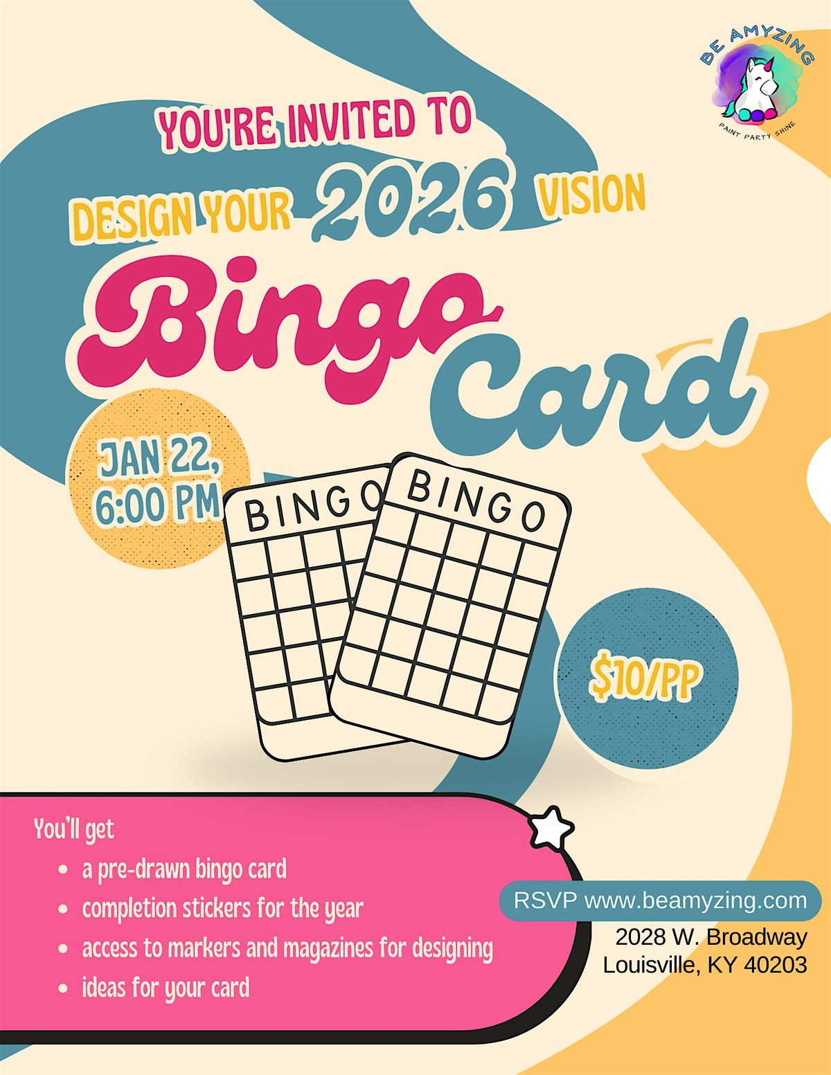 Join us for a creative, vision-board-meets-game-night experience! You’ll design your own oversized 14" x 22" 2026 bingo card packed with the goals, trips, habits, and experiences you want to check off this year.