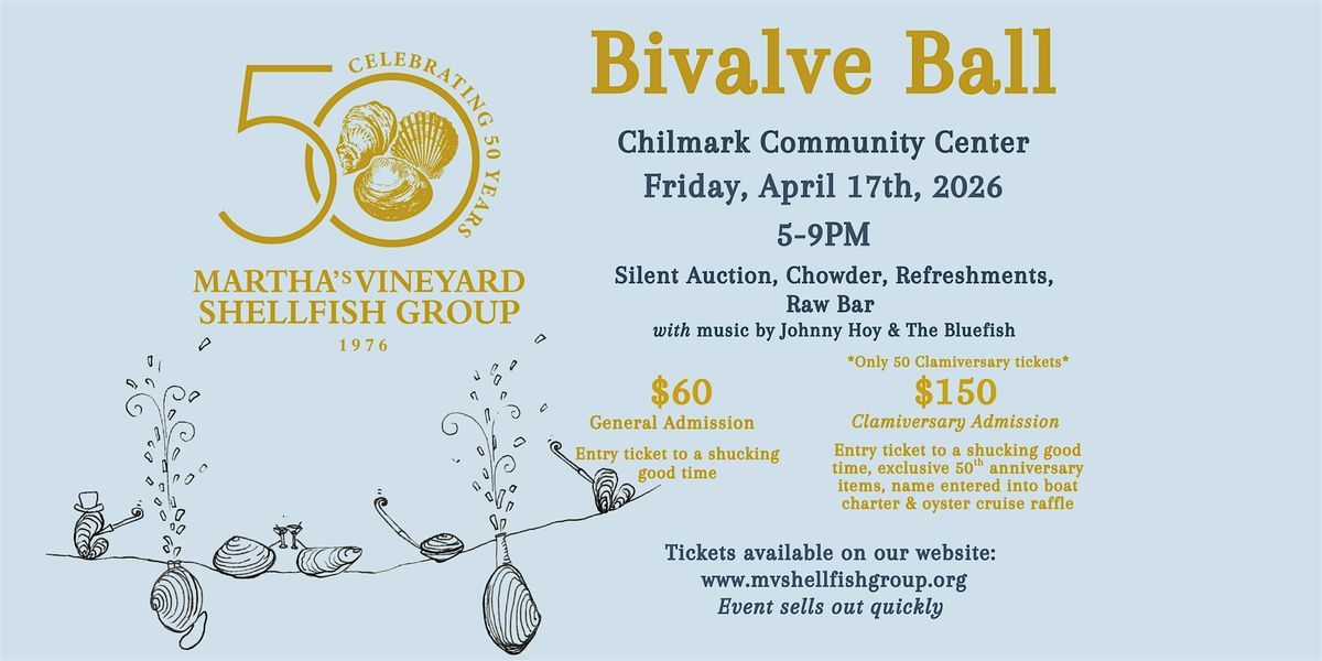 Join the Martha's Vineyard Shellfish Group's annual Spring fundraiser by attending the Bivalve Ball, a waste free event that helps us ensure shellfish resources on the Island for years to come. With support from generous local sponsors, we have a silent auction, raw bar, refreshments and chowder. Dance the night away to Johnny Hoy and the Bluefish, catch up with friends and neighbors, and get a small taste of why the Shellfish Group works so hard to bivalvify the Vineyard.