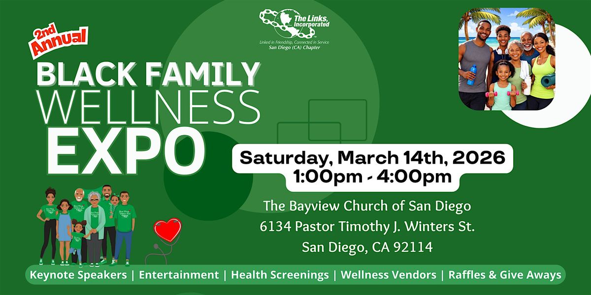 The San Diego (CA) Chapter of The Links, Incorporated is pleased to announce the 2026 Black Family Wellness Expo, a family friendly community-driven event designed to address health and economic disparities and promote wellness in the Black community. The expo will take place on March 14, 2026, from 1:00 PM to 4:00 PM at The Bayview Church of San Diego.