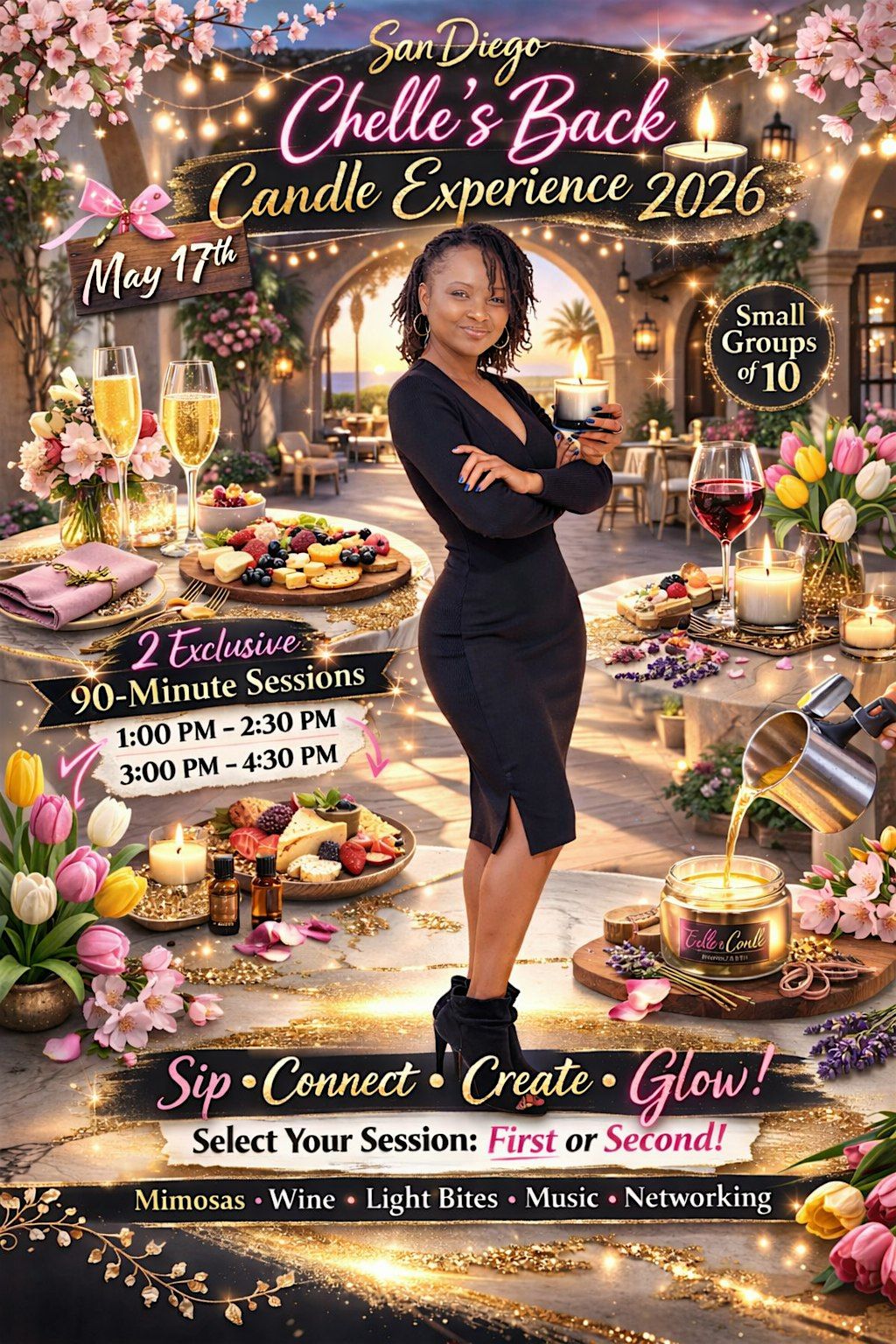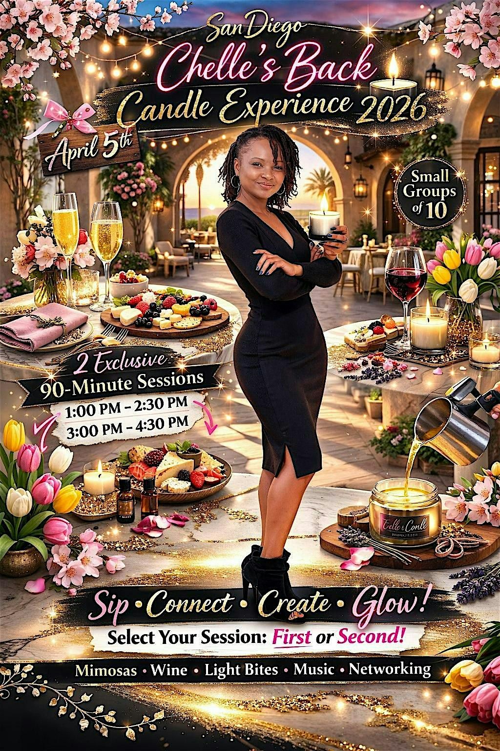San Diego, get ready — Chelle’s Back Candle Experience 2026 is bringing the heat and the glow! Join Chelle for an intimate, vibe-filled experience where mimosas are flowing, wine is poured, light bites are curated to perfection, and the music sets the mood. You’ll create your own custom 2.5-ounce candle alongside Chelle, blending scents and good energy into something uniquely yours. Sessions will be held in small groups of just 10 at a time, giving you space to truly immerse yourself in the candle-making magic — or kick back and enjoy the snacks, networking, and music while you wait your turn. It’s not just a class, it’s a whole experience - sip, connect, create, and glow for the afternoon. 🕯️🥂✨