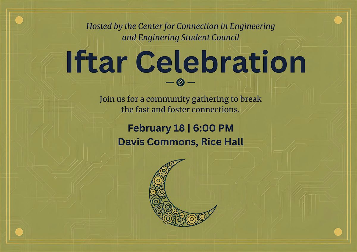 Join the Center for Connection in Engineering and the Engineering Student Council for a delightful evening of breaking fast together at the Davis Commons, in Rice Hall. Meal begins at 6:00pm.