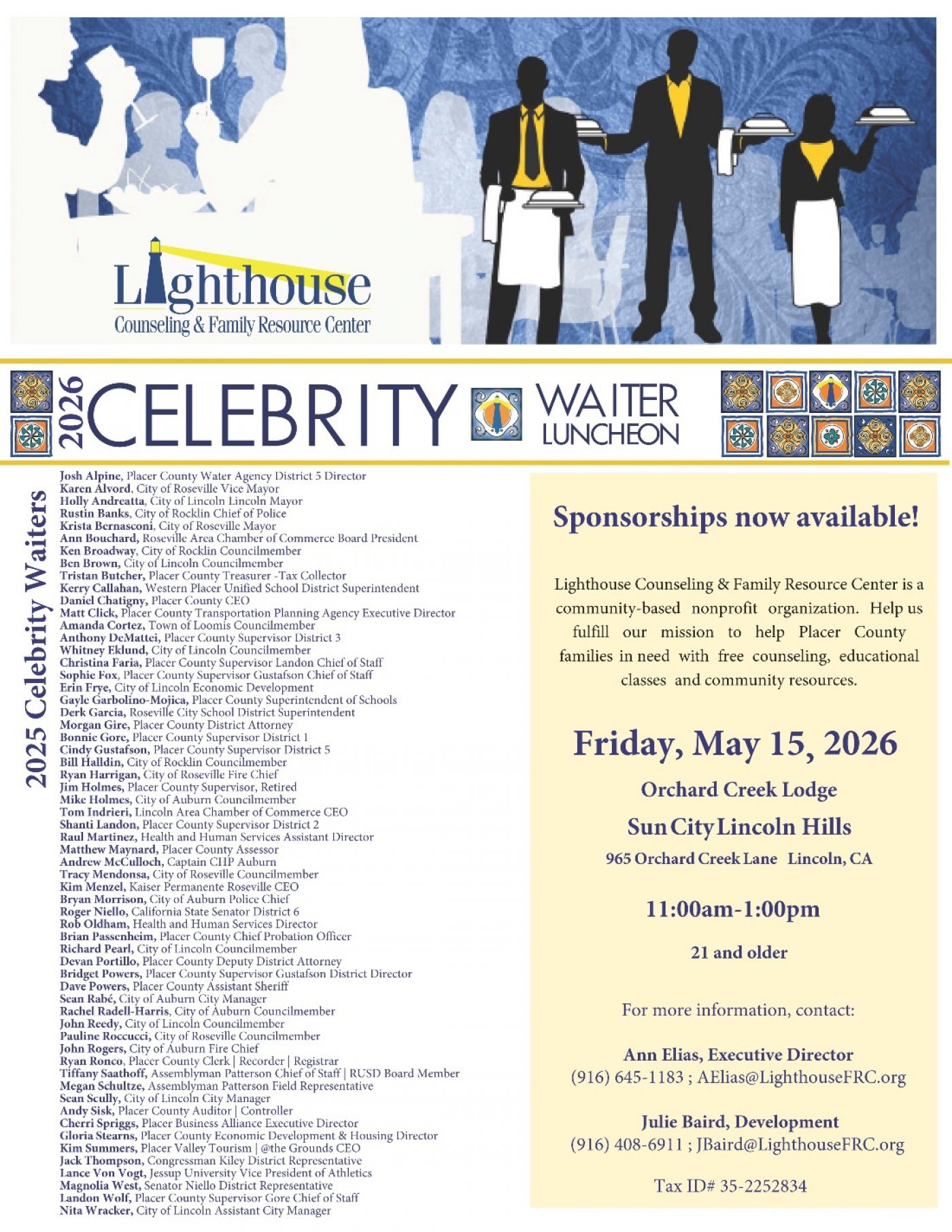 Join us for the 2026 Celebrity Waiter Luncheon—an afternoon of great food, fun, and community spirit. Local leaders step into the role of “celebrity waiters” to help raise funds for mental health counseling and family support services in Placer County.