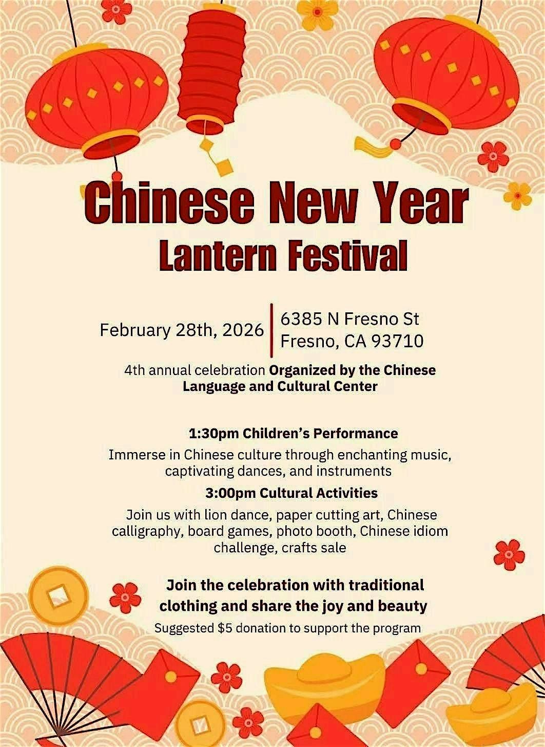 Come celebrate the 2026 Chinese New Year Lantern Festival on February 28, 2026 at 1:30-5pm! This vibrant and lively event will be held at 6385 North Fresno Street, Fresno CA.