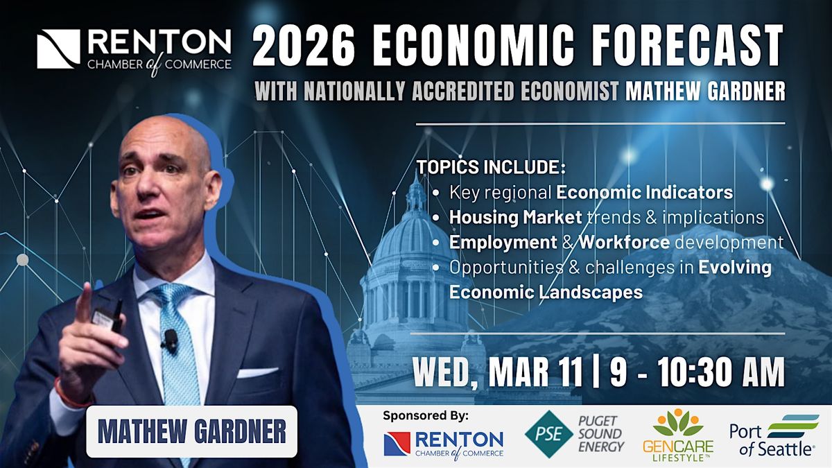 Sponsored by the Port of Seattle, Puget Sound Energy and GenCare Lodge, the Renton Chamber of Commerce proudly presents an exclusive Economic Forecast Event featuring renowned economist Mathew Gardner, Chief Economist at Gardner Economics.