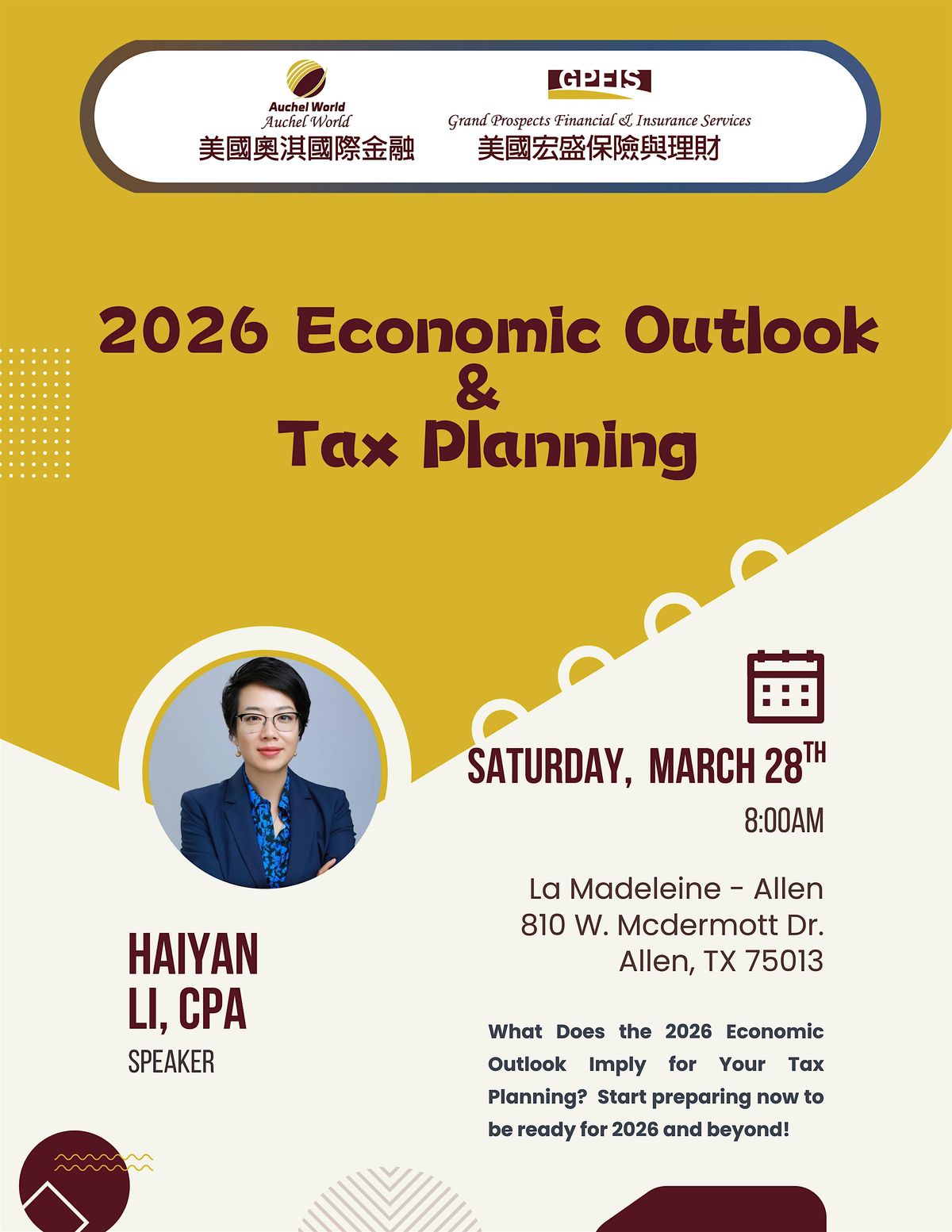 Excited to announce two upcoming seminars on 2026 Tax Planning & Economic Outlook!