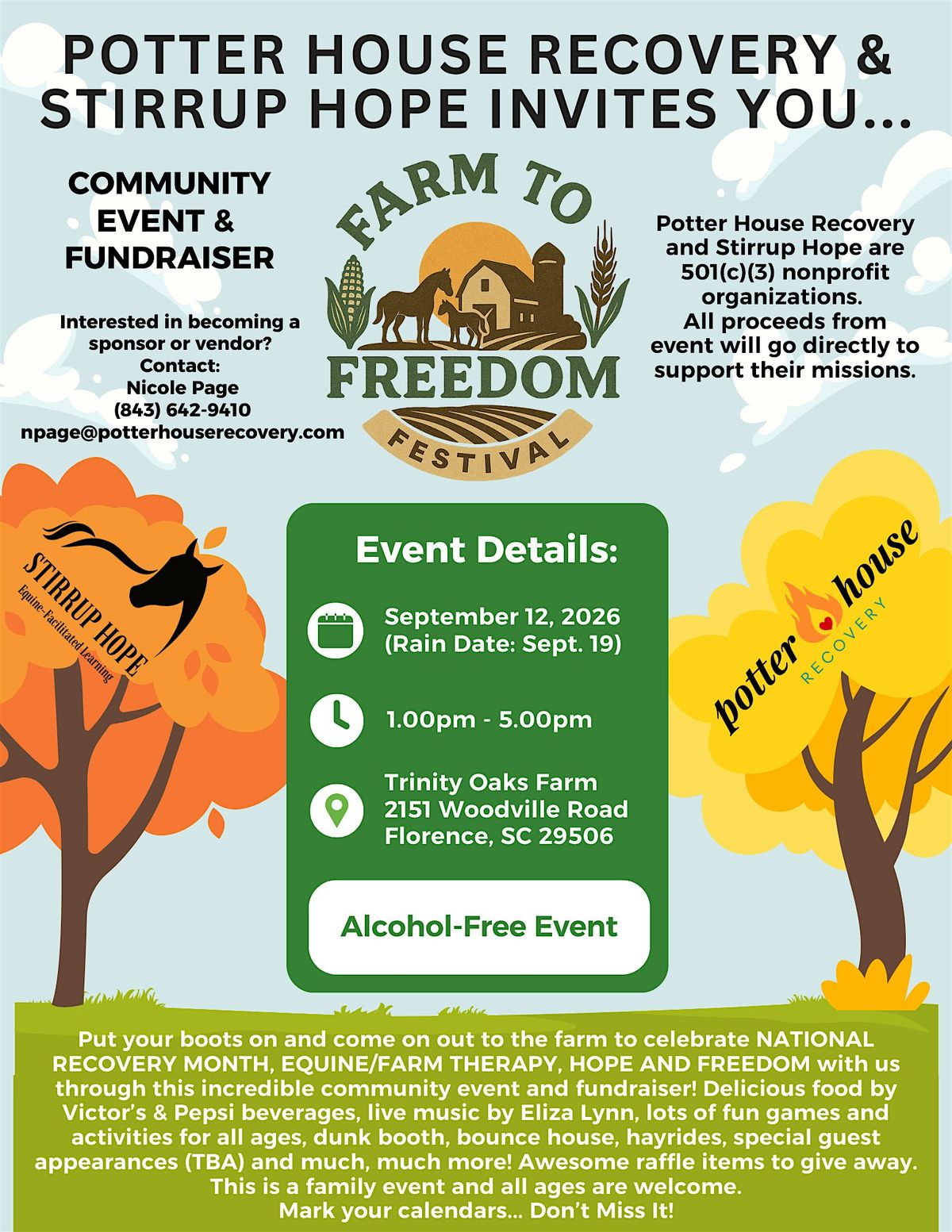 Put your boots on and come on out to the farm to celebrate NATIONAL RECOVERY MONTH, EQUINE/FARM THERAPY, HOPE and FREEDOM with us through this incredible community event and fundraiser! Delicious food by Victor's, Pepsi beverages, live music by Eliza Lynn, lots of fun games and activities for all ages, dunk booth, bounce house, hayrides, special guest appearances and much, much more! Awesome raffle items to give away. This is a FREE family event and all ages are welcome.