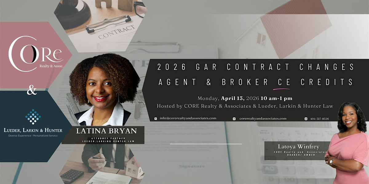 CORE Realty & Associates is partnering with Lueder, Larkin & Hunter Law of Tucker, GA, to host a 3-Hour CE Course: Georgia Real Estate 2026 GAR Contract Changes & Updates, approved for both Agent and Broker credits.
