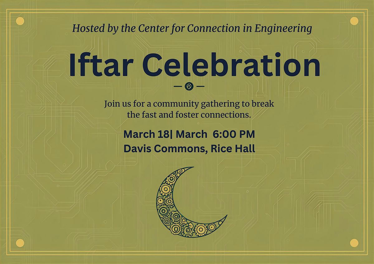 Join us for a delicious Iftar gathering in Rice Hall with The Center for Connection in Engineering. This event is open to all!About this Event