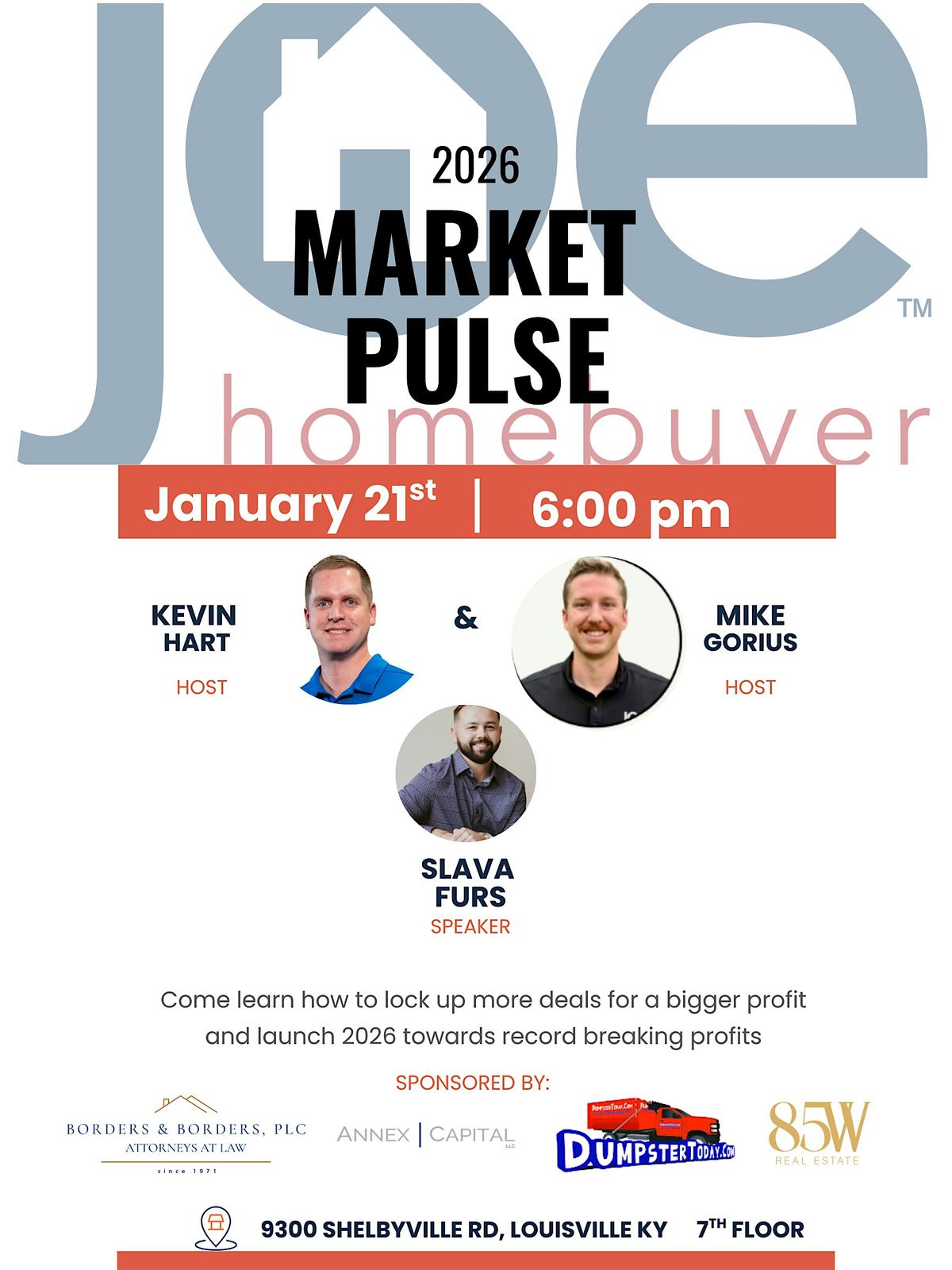 Come learn how to lock up more deals for a bigger profit and launch 2026 towards record breaking profits with Kevin Hart and Mike Gorious, who have closed over 200+ deals in KY/OH/IN. With guest speaker Slava Furs co-owner of 85W Real Estate.