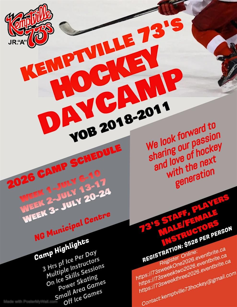 The Kemptville 73's Jr. A Hockey Club are proud to offer three separate weeks of hockey school for the summer of 2026. Week one runs from July 6-10, week two runs July 13-17, week three runs July 20-24 from 8AM-4PM daily. The camp will be open to children born from 2018-2011 with daily on and off ice activities led by 73's coaches, alumni ,current players and female instructors. Participants will be divided into two separate age appropriate groups for the week and receive 3 hours of ice per day with multiple instructors on ice per session. Between on ice sessions the groups will participate in off ice activities that include ball hockey ,soccer, age appropriate off ice training and interactive information sessions.