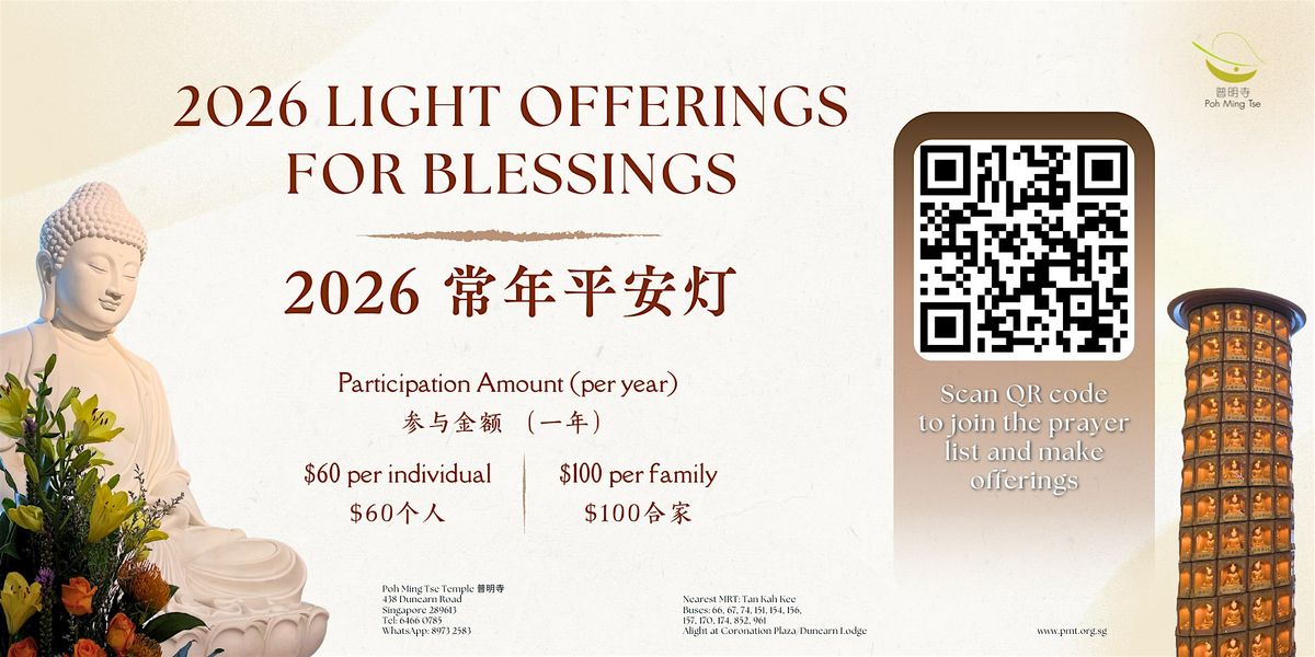 Begin the new year with a year-long Buddha light offering at PMT. Join us individually or as a family to illuminate the path of compassion, peace, and hope for all. Light offering is available throughout the entire year of 2026.