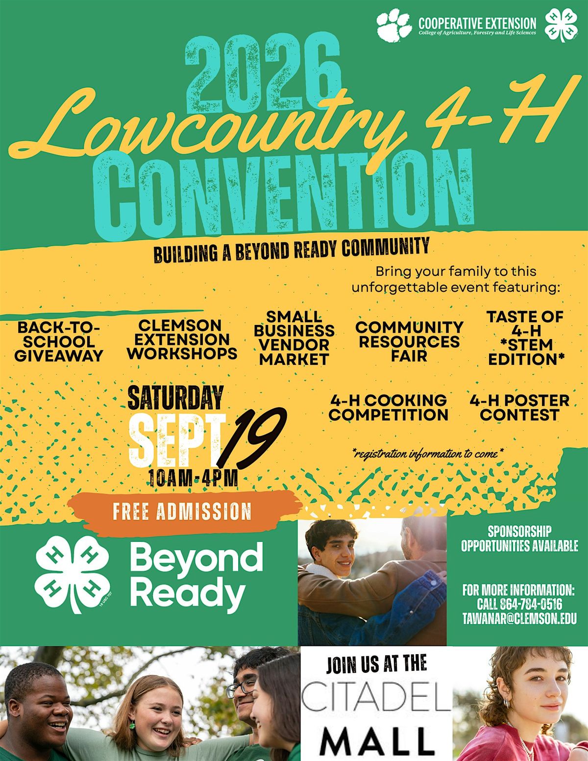 Save the date for our FIRST Lowcountry 4-H Convention taking place September 19, 2026 from 10a-4p at the Citadel Mall in Charleston!
