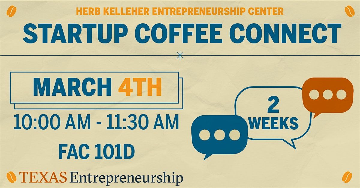 Join the Herb Kelleher Entrepreneurship Center and the Texas Entrepreneurship, for Startup Coffee Connect, a casual networking event for all Longhorn entrepreneurs. Meet other founders, share ideas, learn what’s happening in the UT startup scene, and connect with ambitious minds over a complimentary coffee bar and breakfast tacos.*