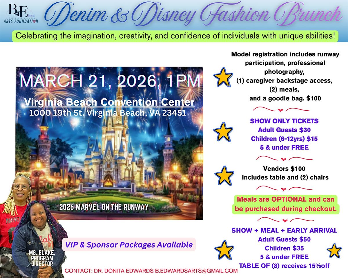 Join us in person for a one-of-a-kind fashion show that blends the worlds of Denim & Disney. Pay for the 11am Pre-show Mixer Mingle with Models or attend the show only @ 1pm. Watch creativity come alive with models strutting the runway with epic denim designs inspired by Disney magic. It's fun, fabulous, and full of surprises! Don't miss out on the ultimate fusion of fashion and fantasy.