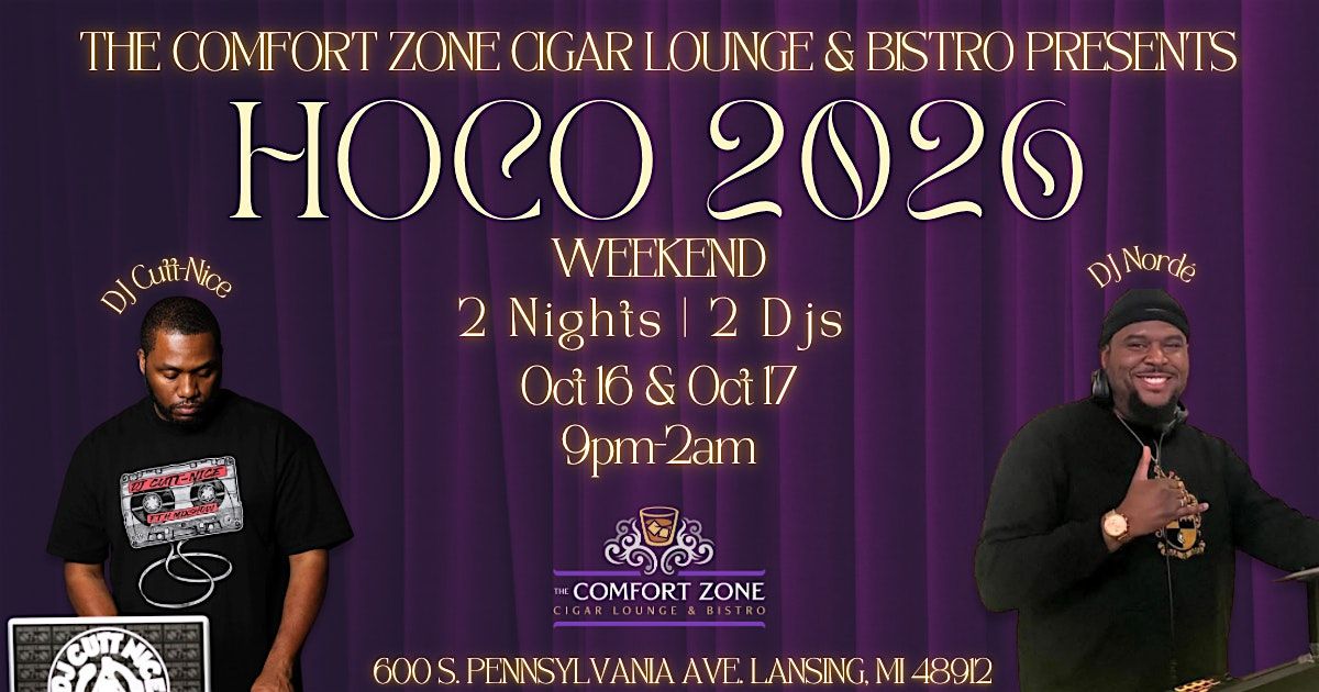 Join us at The Comfort Zone Cigar Lounge & Bistro for HOCO 2026 Weekend — 2 Nights | 2 DJs | One Unmatched Vibe.