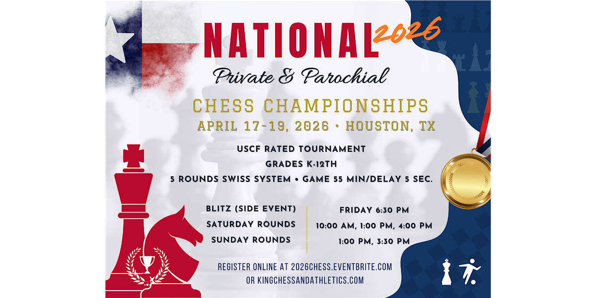 Welcome to the 2026 National Private & Parochial School Chess Championships! This USCF-Rated Tournament is for students in grades K-12. Other details are below: