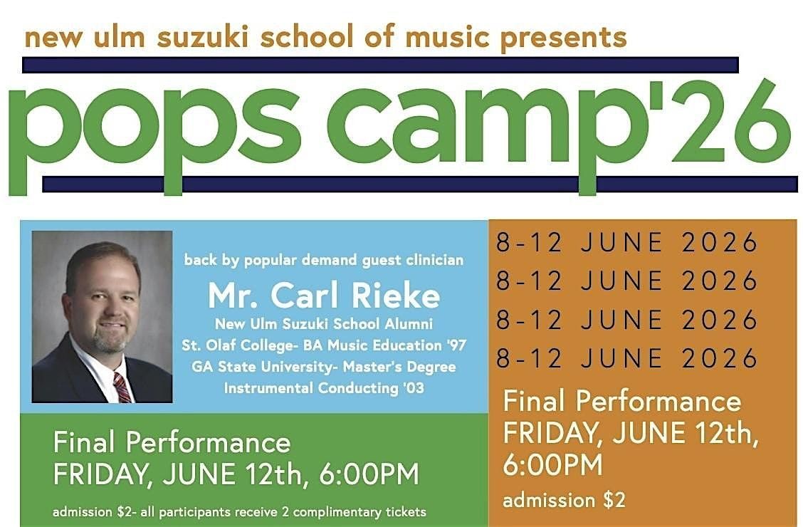 The New Ulm Suzuki School of Music is proud to announce the 2026 Pops Camp with guest clinician Carl Rieke.About this Event