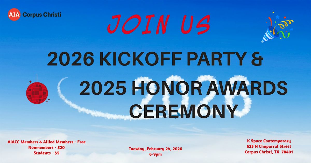Please join us for our 2026 KICK-OFF party and 2025 HONOR AWARDS ceremony!! Enjoy an evening of fun, food, and friends... Meet our Board Members, learn about our committees and volunteer opportunities. Network with our members and industry partners as we celebrate the close of 2025 and the start of the 2026 New Year! The Honor Awards Ceremony will also be held this same evening recognizing those who exhibit outstanding service in the field of architecture to our community.