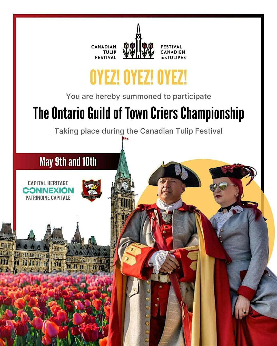 Join the Ontario Guild of Town Criers in partnership with Canadian Tulip Festival and Capital Heritage Connexion for the 2026 Town Crier Competition on May 9th and 10th! Witness 15 Town Criers and Consorts representing the four corners of Ontario as they battle it out for who can perform the best cry. Cries will begin at noon and the final cry will finish at 5.