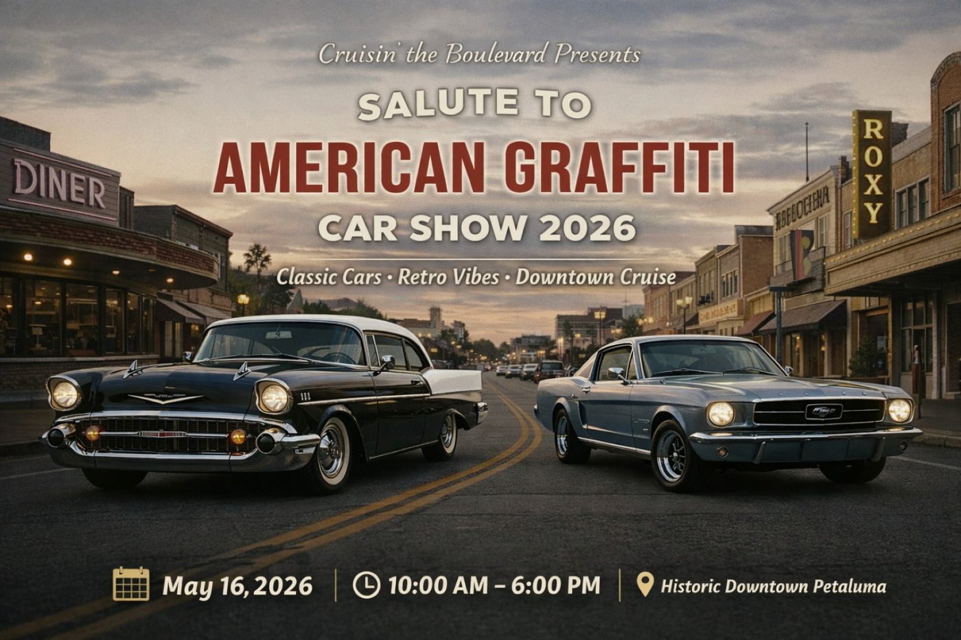 Info: Cruisin' the Boulevard invites American model cars and trucks 1972 or older to join us May 16th for the annual Salute to American Graffiti Car Show. This event features show parking on the streets of historic Downtown Petaluma, the same streets featured in the film, a cruise of a near 2 mile loop along one of Petaluma's most historic neighborhoods, old time live radio dj, and community activities.