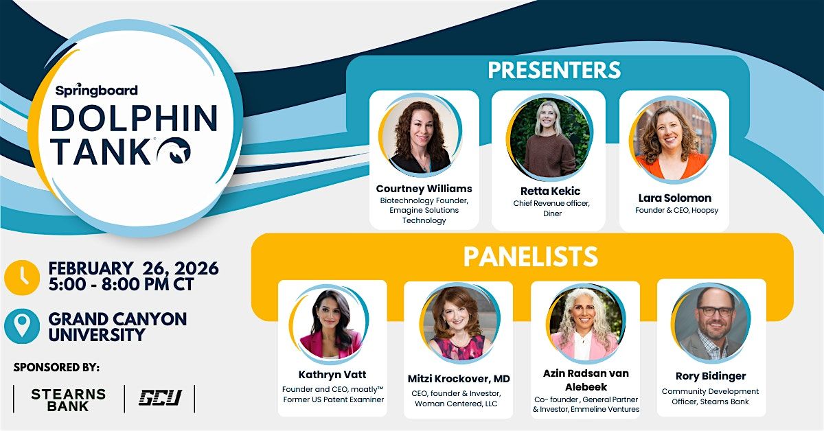 Springboard, in partnership with Stearns Bank and GCU, is bringing Dolphin Tank® to Phoenix, AZ. Springboard’s Dolphin Tank® pitch event brings the power of our collective community to women entrepreneurs innovating in enterprise tech. Our Dolphin Tank® events showcase exciting women-led companies and provide them with the opportunity for connections, capital, and insight from our audience of investors, advisors, and industry leaders.