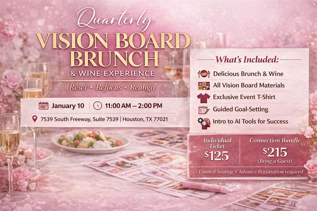 The Quarterly Vision Board Brunch & Wine Experience is an intimate, elevated gathering designed for women who are ready to stop drifting and start moving with purpose. This is not a loud networking event β itβs a guided reset that blends vision, strategy, and connection in a beautiful, welcoming space.