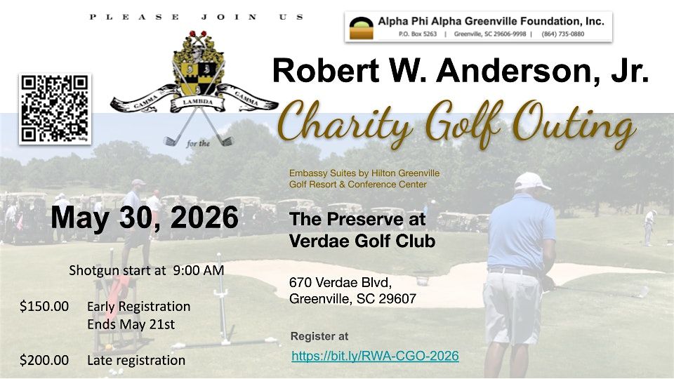 We invite you to participate in our annual Robert W. Anderson, Jr. Golf Outing at the Preserve at Verdae Golf Course on May 30, 2026, in Greenville, South Carolina. Check-in opens at 8:00 am, with a Shotgun start at 9 AM (Lunch starts at ~1:30 PM). Drive range and chipping greens will be available to players early that morning.