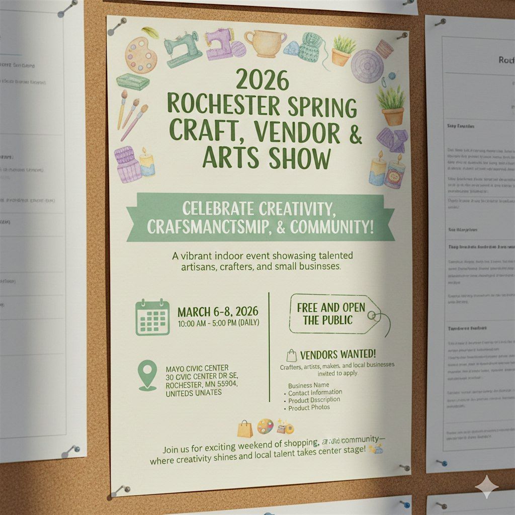 Join us for an exciting weekend of shopping, art, and community at the 2026 Rochester Spring Craft, Vendor and Arts Show—where creativity shines and local talent takes center stage! ✨🛍🎨