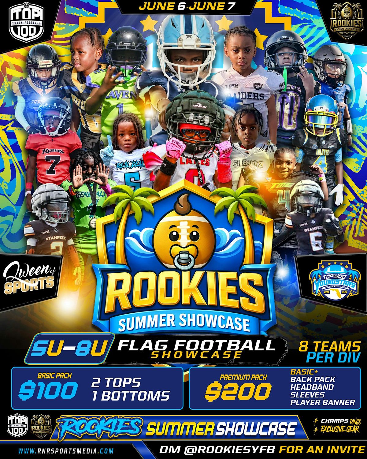 The 2026 ROOKIES Summer Flag Showcase powered by RNRTOP100 will feature top ranked youth football prospects from across the country. Only 10 players per team, so once spots fill up, itβs a wrap. First come first served, no spots will be held without payment.