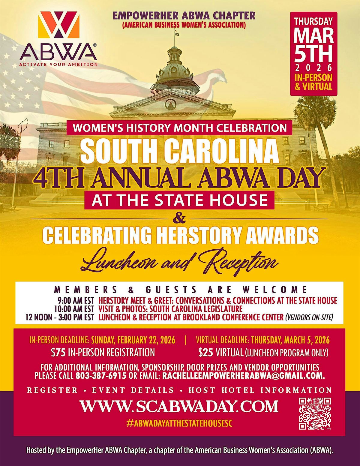 Join us for the 2026 South Carolina ABWA Day at the State House & Celebrating HERstory Awards ~ Transforming Lives Luncheon and Reception on Thursday, March 5, 2026.