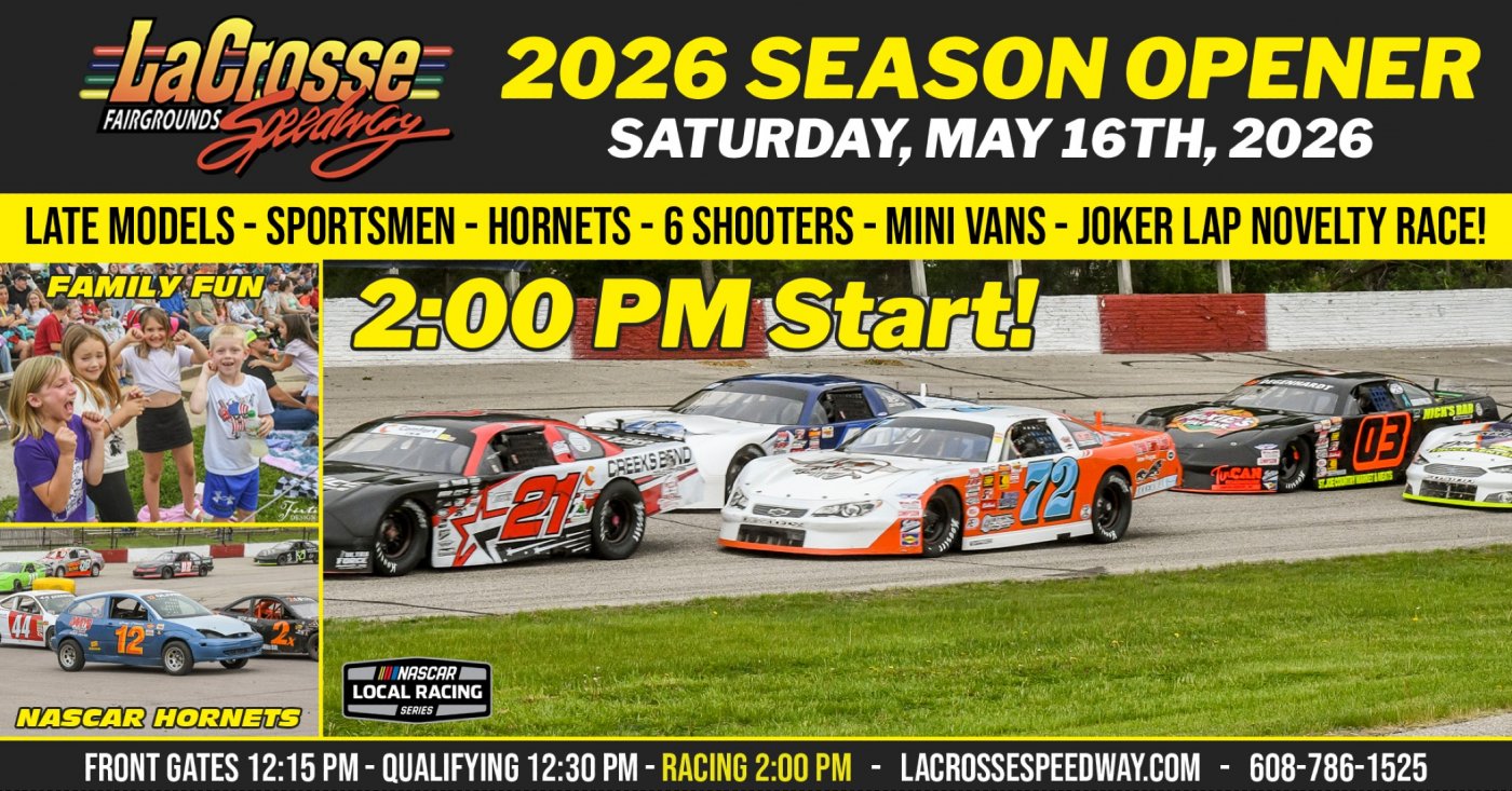 Grab your family and friends and gear up for an unforgettable afternoon of high-speed thrills, edge-of-your-seat racing, and family FUN at LaCrosse Speedway in West Salem, Wisconsin! The 2026 Season kicks off with a bang on Saturday, May 16th, 2026, and you donāt want to miss it!