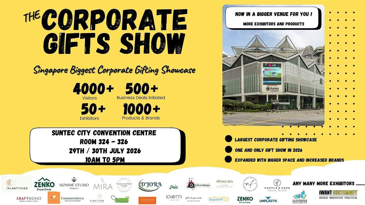 The Singapore Corporate Gifts Show 2026 is scheduled for July 29-39, 2026, at Suntec City Convention Hall, from 10 AM to 5 PM.