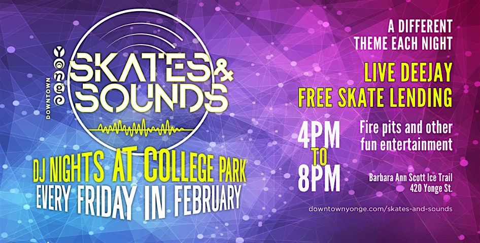 #SkatesAndSounds is back for its seventh season in February 2026, with a stellar lineup of DJs ready to spin the hottest tracks and warm us up! Every Friday night, the Barbara Ann Scott Ice Trail at College Park transforms into an open-air dancefloor, blending music, skating, and winter vibes in the heart of downtown Toronto.