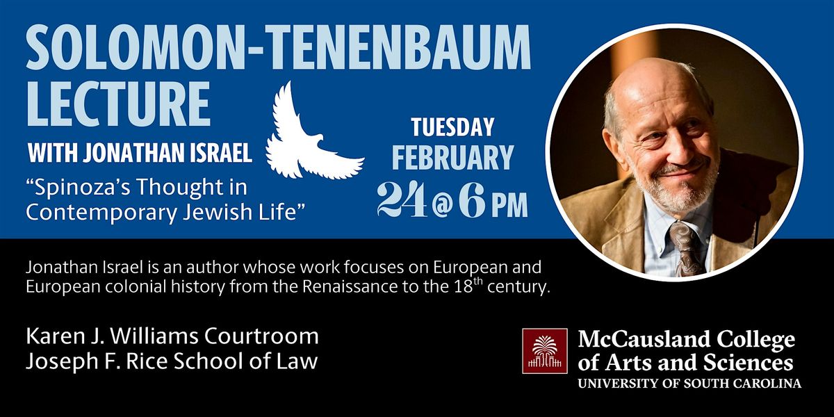 The McCausland College of Arts and Sciences at the University of South Carolina is delighted to announce Jonathan Israel as the featured guest for the 2025 Solomon-Tenenbaum Lectureship in Jewish Studies. We are pleased to invite you to join us for "Spinoza's Thought in Contemporary Jewish Life." with Jonathan Israel in conversation on Tuesday, February 24th at 6 p.m.
