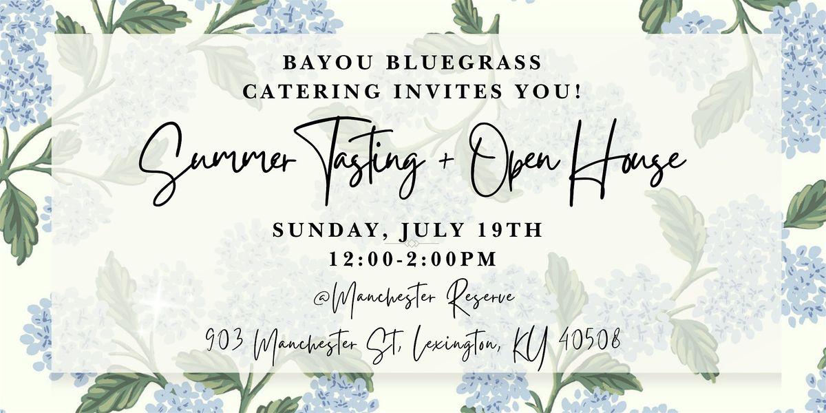 You're cordially invited to join Bayou Bluegrass Catering for our Summer Tasting + Open House. We ask that you select an hour time slot from 12:00- 1:00PM, 12:30- 1:30PM, or 1:00- 2:00 PM.