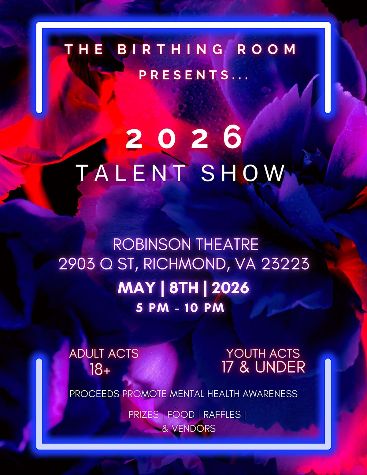 Hosted by The Birthing Room, this talent show is not just another night out, but is a community-centered event using creative expression to promote mental health awareness, healing, and connection. Through music, spoken word, dance, and storytelling, participants are given a safe platform to share their voices while helping reduce stigma around mental and emotional well-being.