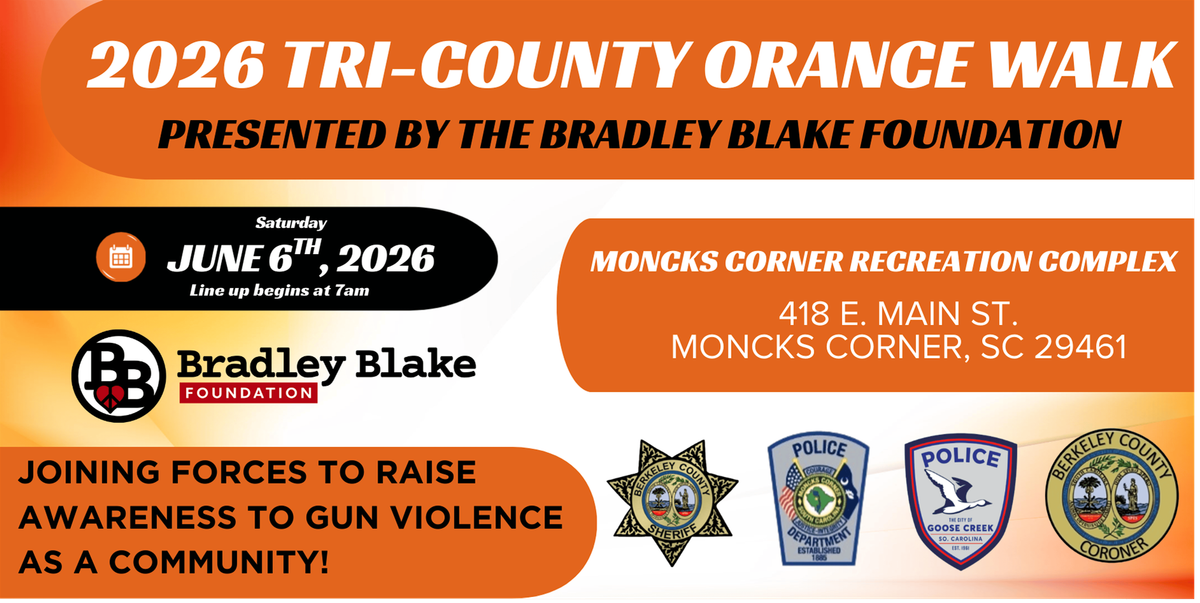 The Bradley Blake Foundation in collaboration with the Berkeley County Sheriff's Office, Moncks Corner + Goose Creek Police Departments and the Berkely County Coroner's Office have planned a Tri-County Orange Walk in Moncks Corner, South Carolina on June 6th, 2026 in honor of gun violence awareness month. The walk is planned for about 3 miles through the heart of Moncks Corner; beginning and ending at the Moncks Corner Recreation Complex, 418 E. Main St., Moncks Corner, SC 29461.