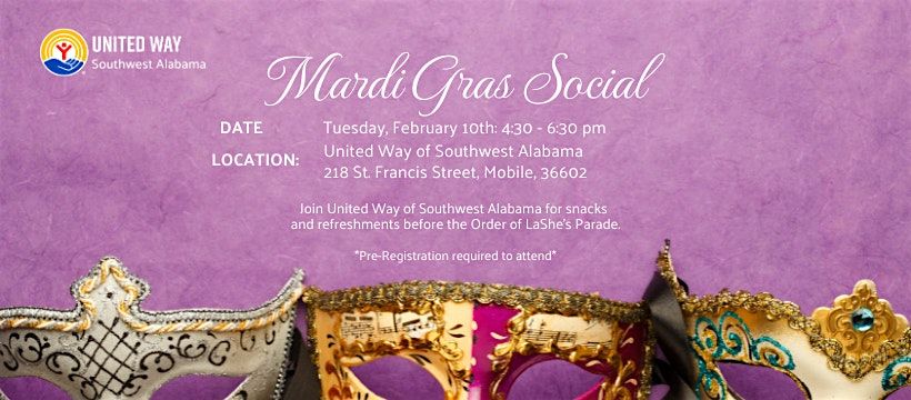 The United Way is hosting their annual Mardi Gras Social before the Order of LaShe's parade. Join the us in celebration of the Mobile community and the Mardi Gras season. Registration is required. All ages welcome.