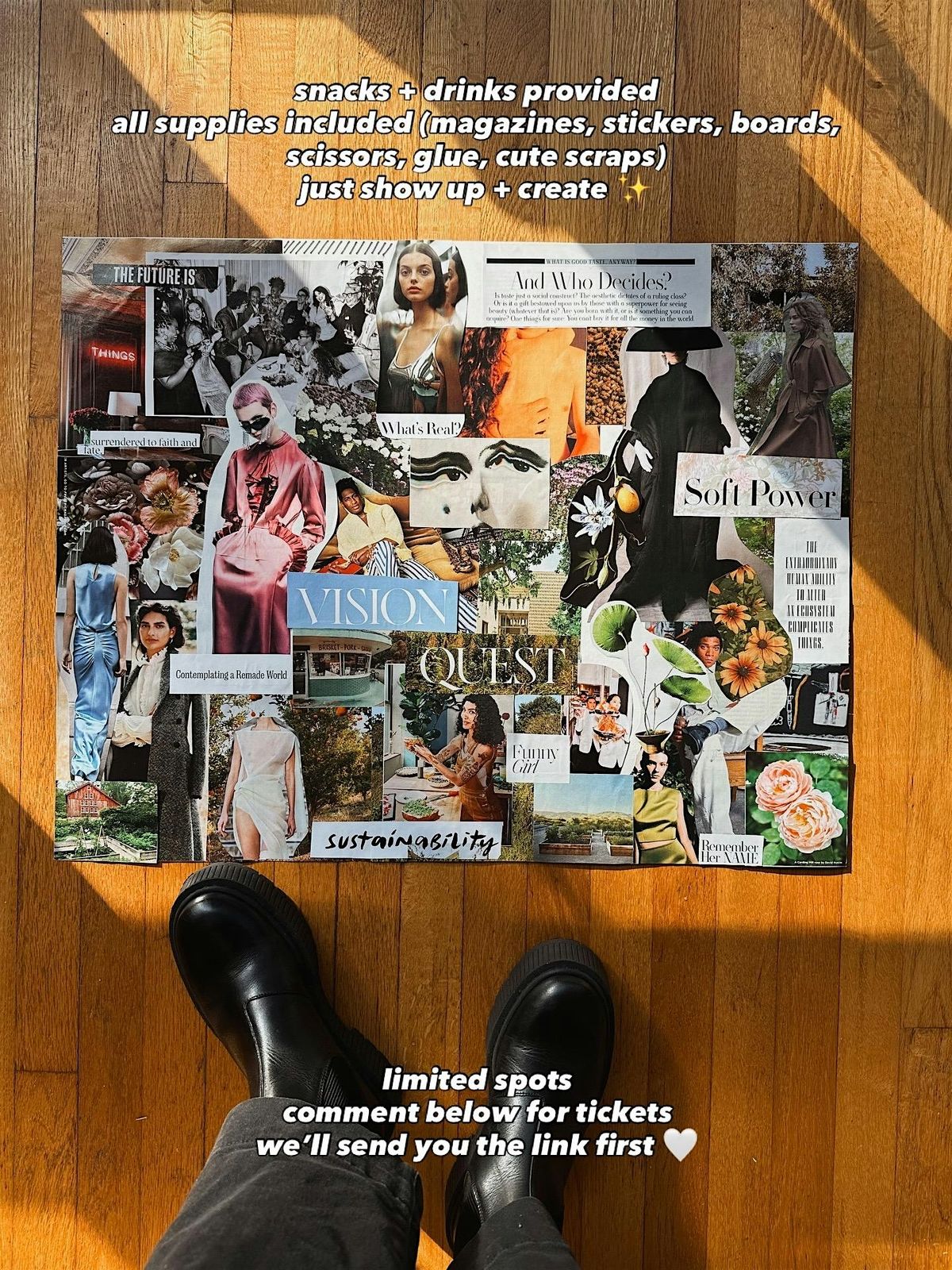 During the event, you’ll cut, paste, collage, and manifest using a curated selection of magazines, papers, textures, and creative materials. You’ll be guided with light prompts to help you focus on themes like personal growth, career, relationships, style, travel, wellness, and overall “rebrand era” energy, but there’s no pressure to do it any specific way. This is your vision, your pace, your moment.