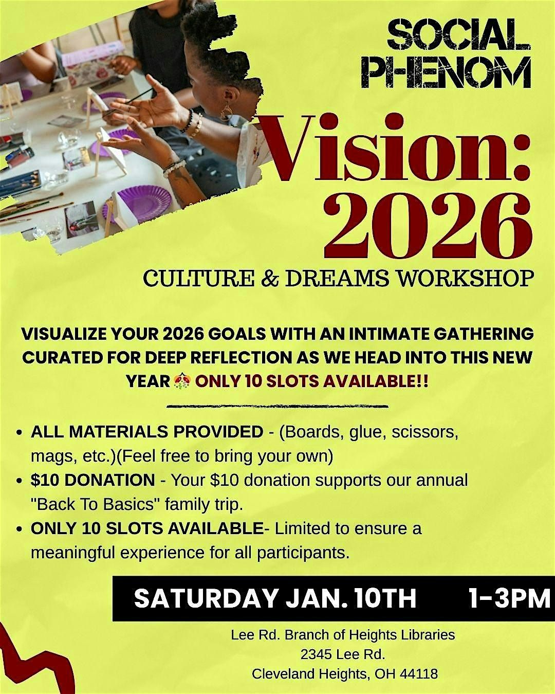 Get ready to dive into the vibrant mix of culture and dreams at our in-person event, 2026 Vision! It’s all about exploring creative vibes, connecting with amazing people, and sharing inspiring stories through your vision board (supplies provided). Whether you’re here to soak it all in or bring your own spark, this is the place to be. Don’t miss out on a day filled with passion, fun, and a time for you build the future you want! ($10 Ticket fee is a donation towards our mission)