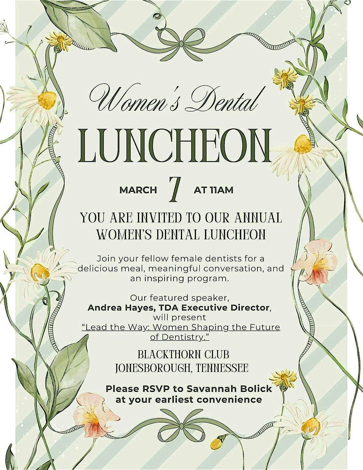 You are warmly invited to attend the 2026 Annual Woman’s Dental Luncheon! This is such a valuable and meaningful event for the female dentists in our district to come together for networking, fellowship, and encouragement within our profession.