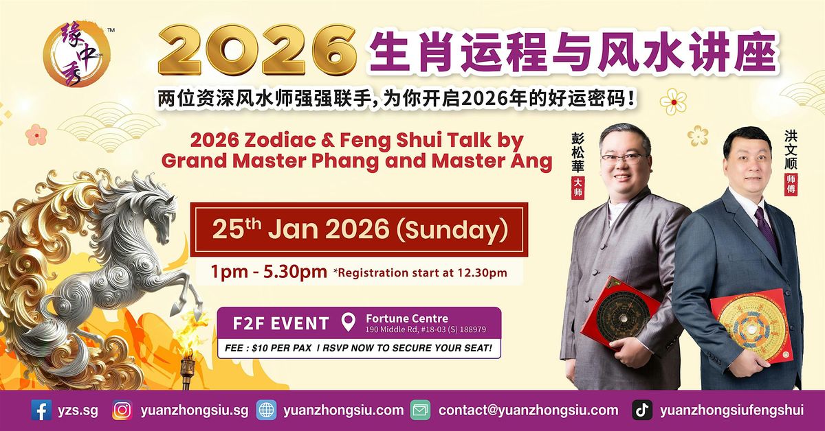 Kickstart 2026 with Singapore’s top Feng Shui and Astrology experts, Grand Master Hillary Phang and popular Geomancer Master Ang. Be among the first to uncover what the Year of the Horse has in store and learn how to chart your path toward greater prosperity.